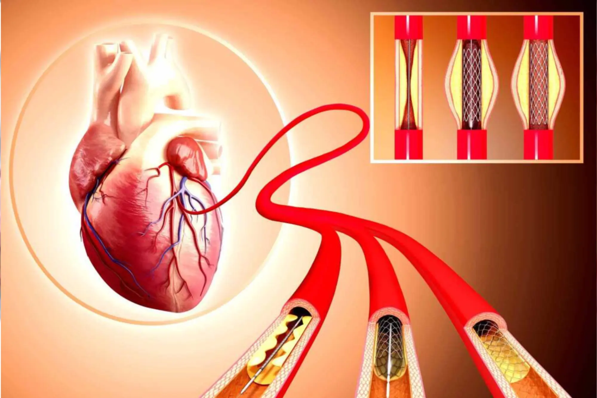 A catheter is inserted through the groin or wrist artery to access heart vessels.