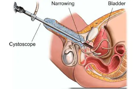 Under anesthesia, a cystoscope is passed through the urethra to reach the bladder for visual guidance.