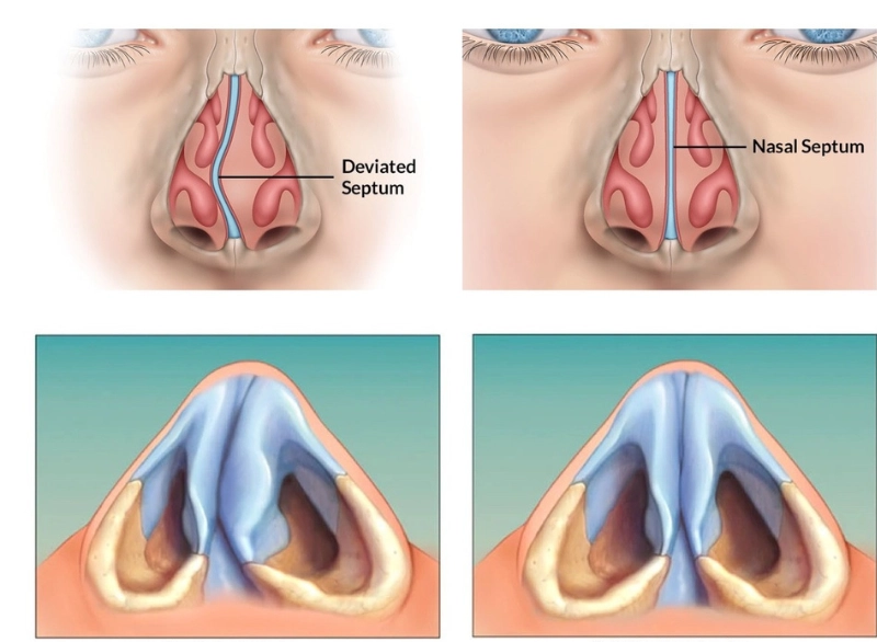 The surgeon corrects the deviation by trimming, repositioning, or removing cartilage and bone inside the nose.